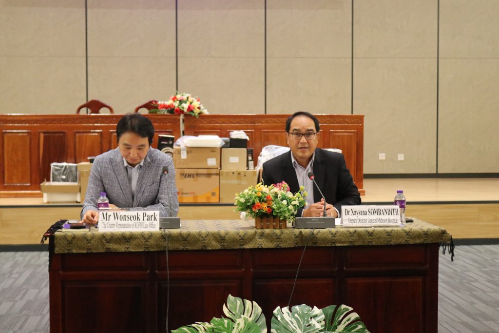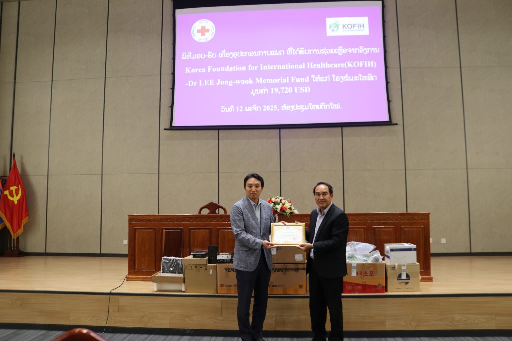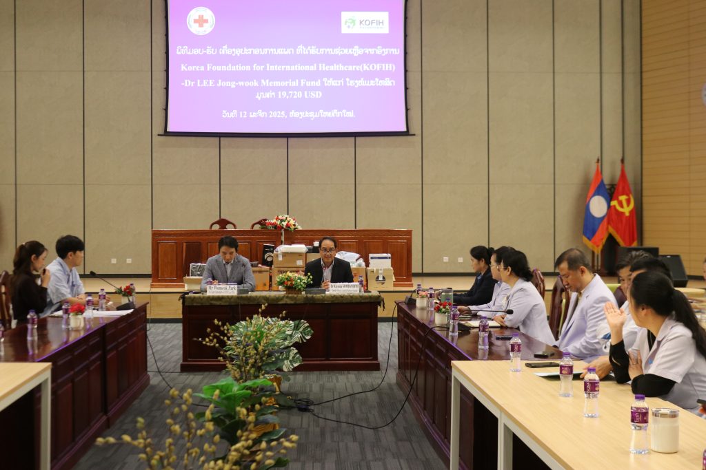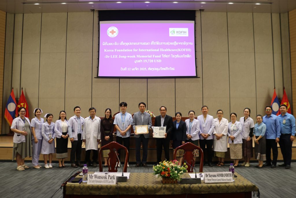 ວັນທີ 12 ພະຈິກ 2025 ທີ່ໂຮງໝໍມະໂຫສົດ, ອົງການ Korea Foundation for International Heealthcare (KOFIH) – Dr LEE Jong-wook Memorial Fund ໄດ້ມອບເຄື່ອງອຸປະກອນການແພດ ມູນຄ່າ 19,720 USD (ສິບເກົ້າພັນເຈັດຮ້ອຍຊາວໂດລາສະຫາລັດ) ໃຫ້ແກ່ ໂຮງໝໍມະໂຫສົດ, ເພື່ອນຳໃຊ້ເຂົ້າໃນການປິ່ນປົວຄົນເຈັບທີ່ມາໃຊ້ບໍລິການຢູ່ໂຮງໝໍ, ໂດຍໃຫ້ກຽດການມອບ-ຮັບ ໃນຄັ້ງນີ້, ແມ່ນໂດຍ ທ່ານ ດຣ. ໄຊຊະນະ ສົມບັນດິດ ຮອງຜູ້ອຳນວຍການໂຮງໝໍມະໂຫສົດ ແລະ ທ່ານ Wonseok Park The Country Representative of KOFIH Laos Office, ໃນໄລຍະຜ່ານມາທາງອົງການ KOFIH ໄດ້ໃຫ້ທຶນສະໜັບສະໜູນການສຶກສາໃນແຕ່ລະປີ ໃນການຍົກລະດັບຄວາມຮູ້ຄວາມສາມາດທາງດ້ານວິຊາການ ໃຫ້ແກ່ບຸກຄະລາກອນ ແພດໝໍ ແລະ ພະຍາບານ, ໂຮງໝໍມະໂຫສົດ.